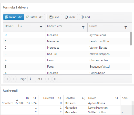 After adding a record the Komment table and related audit trail will look like this:<br>